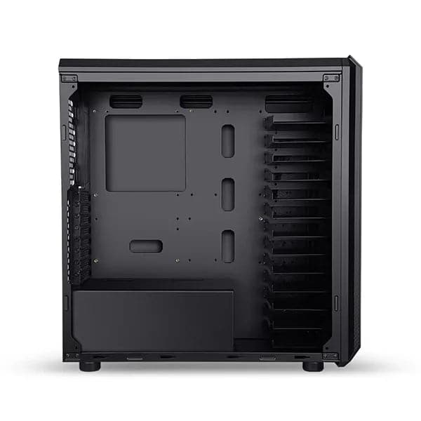 The Vanguard supports massive storage capacity and can support upto thirteen 3.5” HDD or 2.5” SSD. The front IO panel is rich in terms of connectivity and has three USB ports available with three additional spaces for you to load it with the ports of your choice and requirement.
