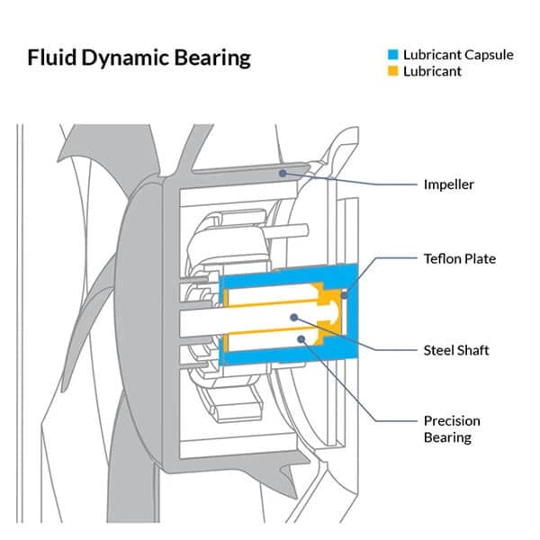 The Fluid Dynamic Bearing comes with an oil capsule that avoids lubricant leakage. Thus this bearing is as quiet as a sleeve bearing but comes with a significantly higher service life.