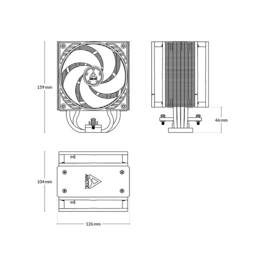 The ARCTIC Freezer 36 ARGB measures 159 mm in height and 126 mm in width and 104 mm in depth. The dimensions of the ARCTIC Freezer 36 ARGB make it suitable for most standard PC cases because of its compact size. It remains essential to verify the clearance specifications of your case before making any purchase to guarantee compatibility. The height measurement of the cooler stands out as crucial because it must maintain adequate space between itself and the case side panel. A pre-check of these dimensions ensures installation stability and proper system placement for the cooler.