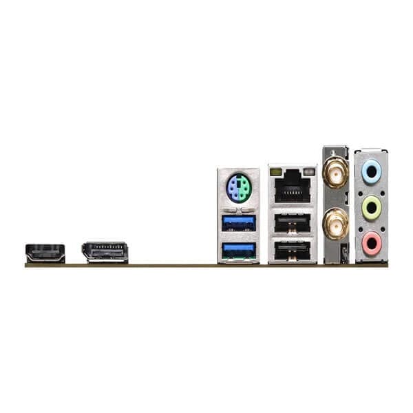 - 2 x Antenna Ports - 1 x PS/2 Mouse/Keyboard Port - 1 x HDMI Port - 1 x DisplayPort 1.4 - 2 x USB 3.2 Gen1 Ports (Supports ESD Protection) - 2 x USB 2.0 Ports (Supports ESD Protection) - 1 x RJ-45 LAN Port with LED (ACT/LINK LED and SPEED LED) - HD Audio Jacks: Line in / Front Speaker / Microphone |