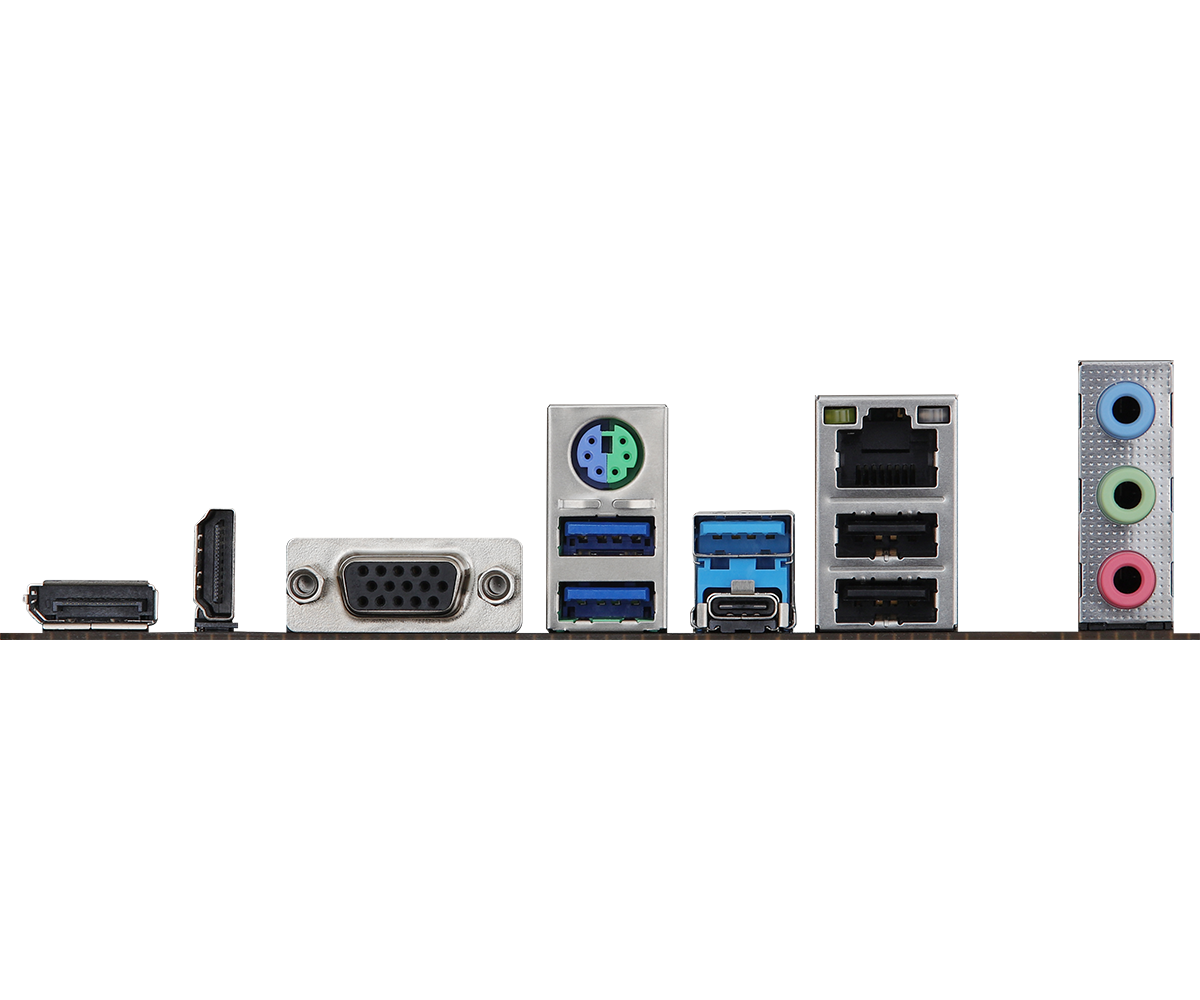 | Rear Panel I/O | - 2 x Antenna Mounting Points - 1 x PS/2 Mouse/Keyboard Port - 1 x D-Sub Port - 1 x HDMI Port - 1 x DisplayPort 1.4 - 1 x USB 3.2 Gen1 Type-C Port - 3 x USB 3.2 Gen1 Type-A Ports - 2 x USB 2.0 Ports - 1 x RJ-45 LAN Port - HD Audio Jacks: Line in / Front Speaker / Microphone |