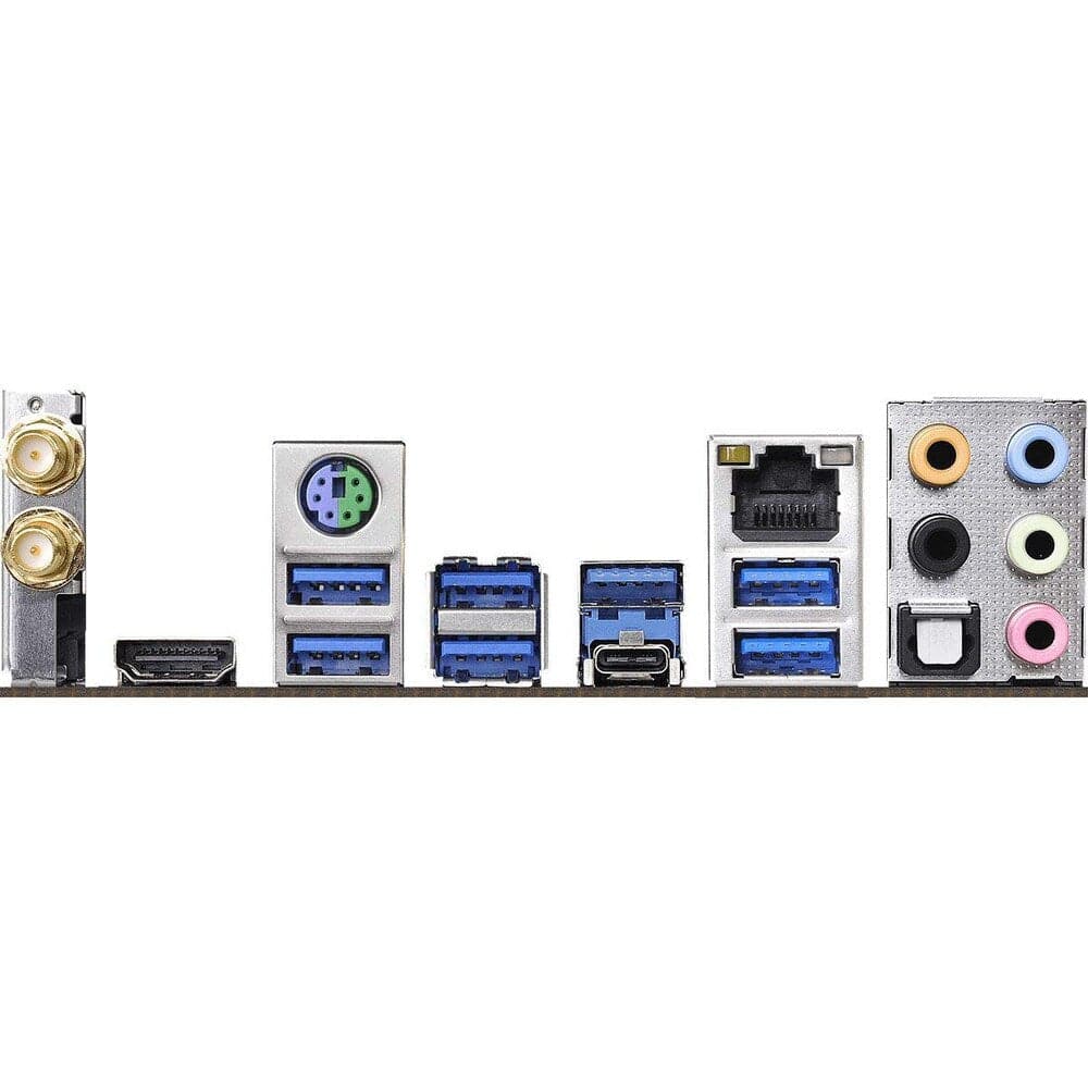 - 2 x Antenna Ports - 1 x PS/2 Mouse/Keyboard Port - 1 x HDMI Port - 1 x Optical SPDIF Out Port - 1 x USB 3.1 Gen2 Type-A Port (10 Gb/s) (Supports ESD Protection) - 1 x USB 3.1 Gen2 Type-C Port (10 Gb/s) (Supports ESD Protection) - 6 x USB 3.1 Gen1 Ports (Supports ESD Protection) - 1 x RJ-45 LAN Port with LED (ACT/LINK LED and SPEED LED) - HD Audio Jacks: Rear Speaker / Central / Bass / Line in / Front Speaker / Microphone |