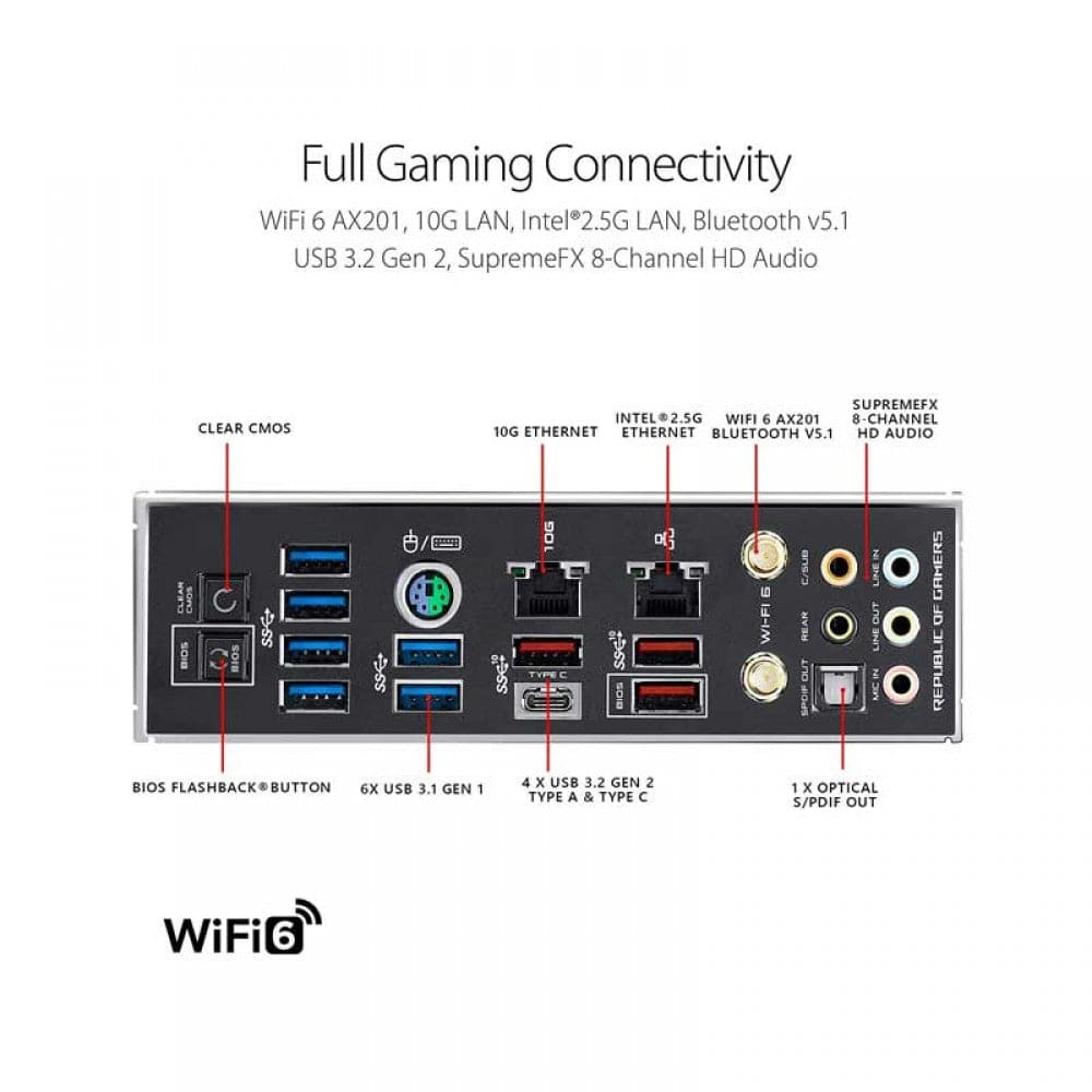 1 x HDMI 4 x USB 3.1 Gen 2 6 x USB 3.1 Gen 1 1 x Optical S/PDIF out 1 x Clear CMOS button(s) 1 x USB BIOS Flashback® Button(s) 1 x ASUS Wi-Fi Module 5 x Gold-plated audio jacks Anti-surge LAN (RJ45) port 1 x AQC-111C 5G LAN port |