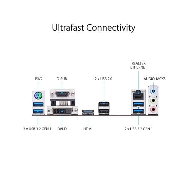 1 x PS/2 keyboard/mouse combo port(s) 1 x DVI-D 1 x D-Sub 1 x HDMI 1 x LAN (RJ45) port(s) 4 x USB 3.2 Gen 1 (blue) Type-A 2 x USB 2.0 3 x Audio jack(s)  |