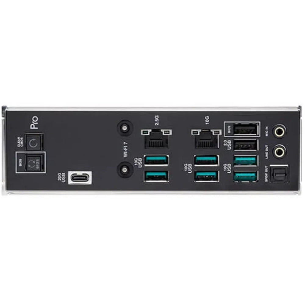 | Back Panel I/O Ports | 1 x USB 20Gbps port (1 x USB Type-C®) 6 x USB 10Gbps ports (6 x Type-A) 2 x USB 2.0 port (2 x Type-A) 1 x Wi-Fi Module 1 x Marvell® AQtion 10Gb Ethernet port 1 x Intel® 2.5Gb Ethernet port 2 x Audio jacks 1 x Optical S/PDIF out port 1 x BIOS FlashBack™ button 1 x Clear CMOS button |