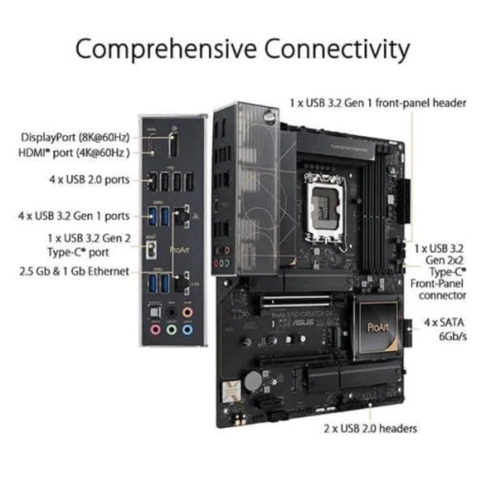 ASUS ProArt B760-Creator D4 is an enhanced motherboard designed for content creation workloads like virtual production, 3D rendering and 4K/8K video editing. It unleashes the performance of 13th & 12th Gen Intel® Core™ processors through robust power delivery and cooling design, and its comprehensive connectivity includes three M.2 slots, 2.5 Gb and 1 Gb Ethernet, a USB 3.2 Gen 2x2 Type-C® front-panel connector and a ThunderboltTM 4 header.