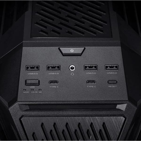 The front of any ROG chassis has to offer a host of connectors, and the ROG Hyperion adds to the tradition with two USB Type-C® connectors that can offer up to 20 Gbps of data transfer and up 60 watts of fast charging with a compatible motherboard.