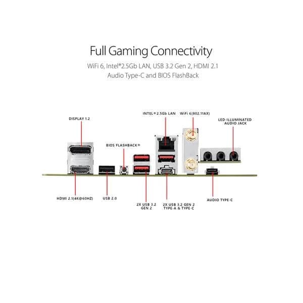 - High-performance Gaming Networking: On-board WiFi 6 (802.11ax), Bluetooth V5.1 and 2.5 Gb LAN with ASUS LANGuard