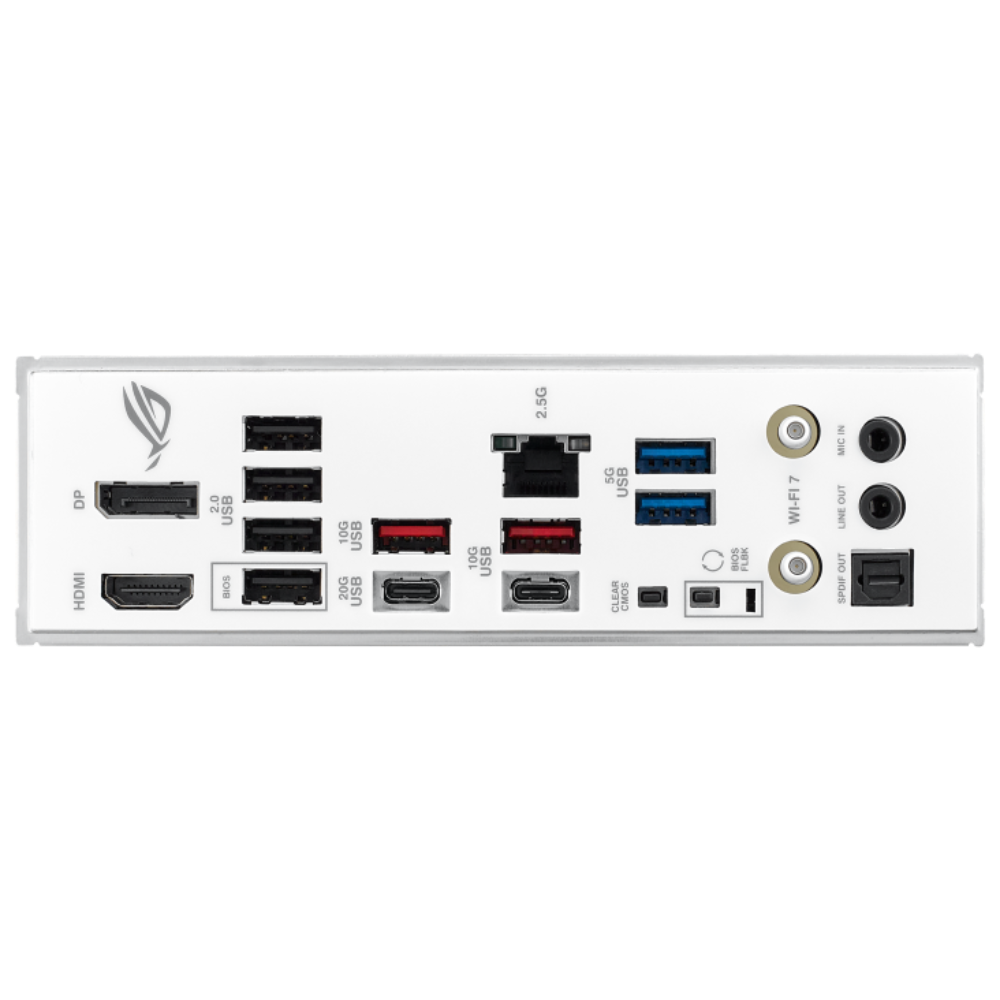 | Back Panel I/O Ports | 1 x USB4® (20Gbps) port (1 x USB Type-C®) 3 x USB 10Gbps ports (2 x Type-A + 1 x USB Type-C®) 2 x USB 5Gbps ports (2 x Type-A) 4 x USB 2.0 ports (4 x Type-A) 1 x DisplayPort 1 x HDMI™ port 1 x Wi-Fi module 1 x Intel® 2.5Gb Ethernet port 2 x Audio jacks 1 x Optical S/PDIF out port 1 x BIOS FlashBack™ button 1 x Clear CMOS button |