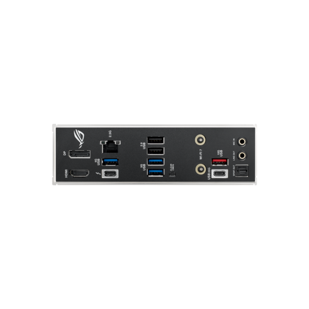 | Back Panel I/O Ports | 1 x Thunderbolt™ 4 port (1 x USB Type-C®) 1 x USB 20Gbps port (1 x USB Type-C®) 1 x USB 10Gbps ports (1 x Type-A) 3 x USB 5Gbps ports (3 x Type-A) 2 x USB 2.0 ports (2 x Type-A) 1 x DisplayPort 1 x HDMI™ port 1 x Wi-Fi module 1 x Intel® 2.5Gb Ethernet port 2 x Audio jacks 1 x Optical S/PDIF out port 1 x Clear CMOS button |