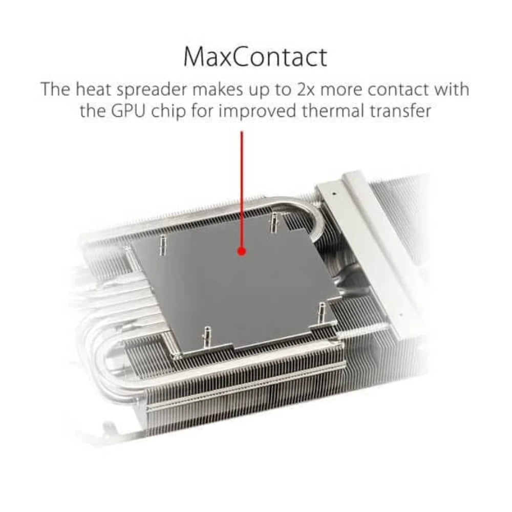 To get heat up off the die and into the heatsink array, we’ve engaged MaxContact technology to polish the surface of the heat spreader and improve smoothness at the microscopic level. The extra flatness allows for better contact with the die for enhanced thermal transfer.