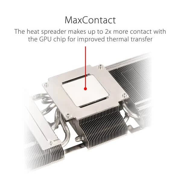 To get heat up off the die and into the heatsink array, we’ve engaged MaxContact technology to polish the surface of the heat spreader and improve smoothness at the microscopic level. The extra flatness allows for better contact with the die for enhanced thermal transfer.