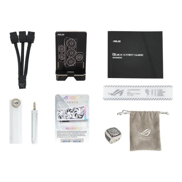 1 x Collection Card 1 x Speedsetup Manual 1 x Adapter Cable (1 to 3) 1 x ROG White Graphics Card Holder 1 x ROG White Velcro Hook & Loop 1 x Thank you Card 1 x ROG Ring