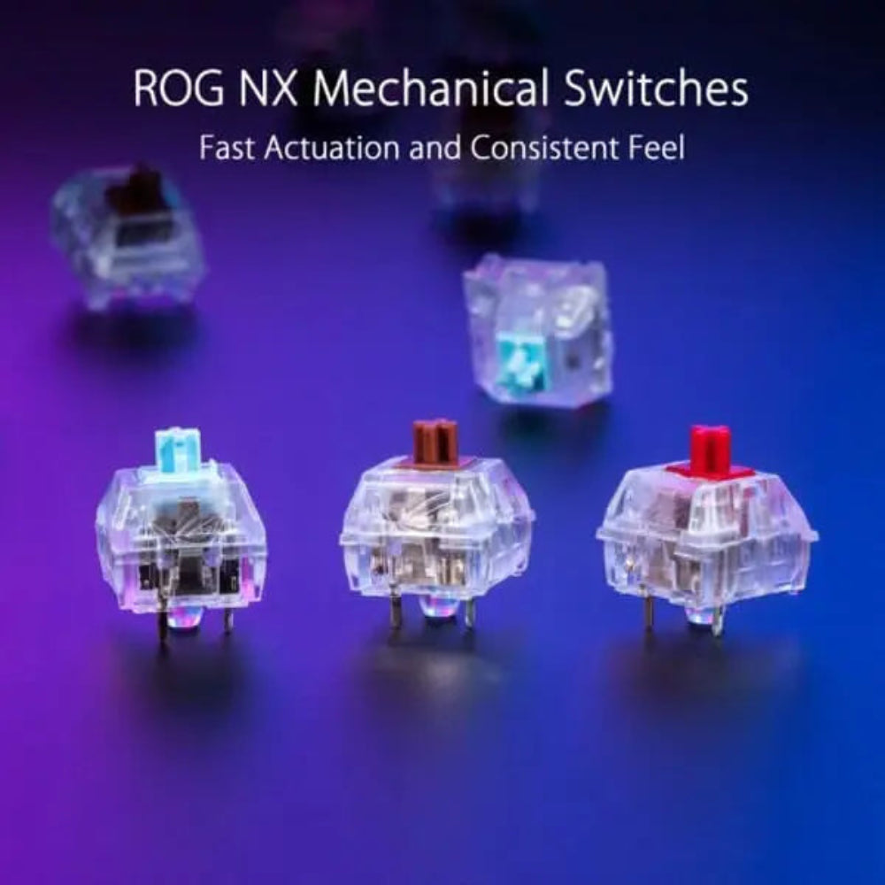 - ROG NX mechanical switches: Lubricated stem for smooth clicks, lubricated housing to eliminate bouncing noises, fast actuation and ROG-tuned force curves for great keystroke feel with great keystroke consistency.
