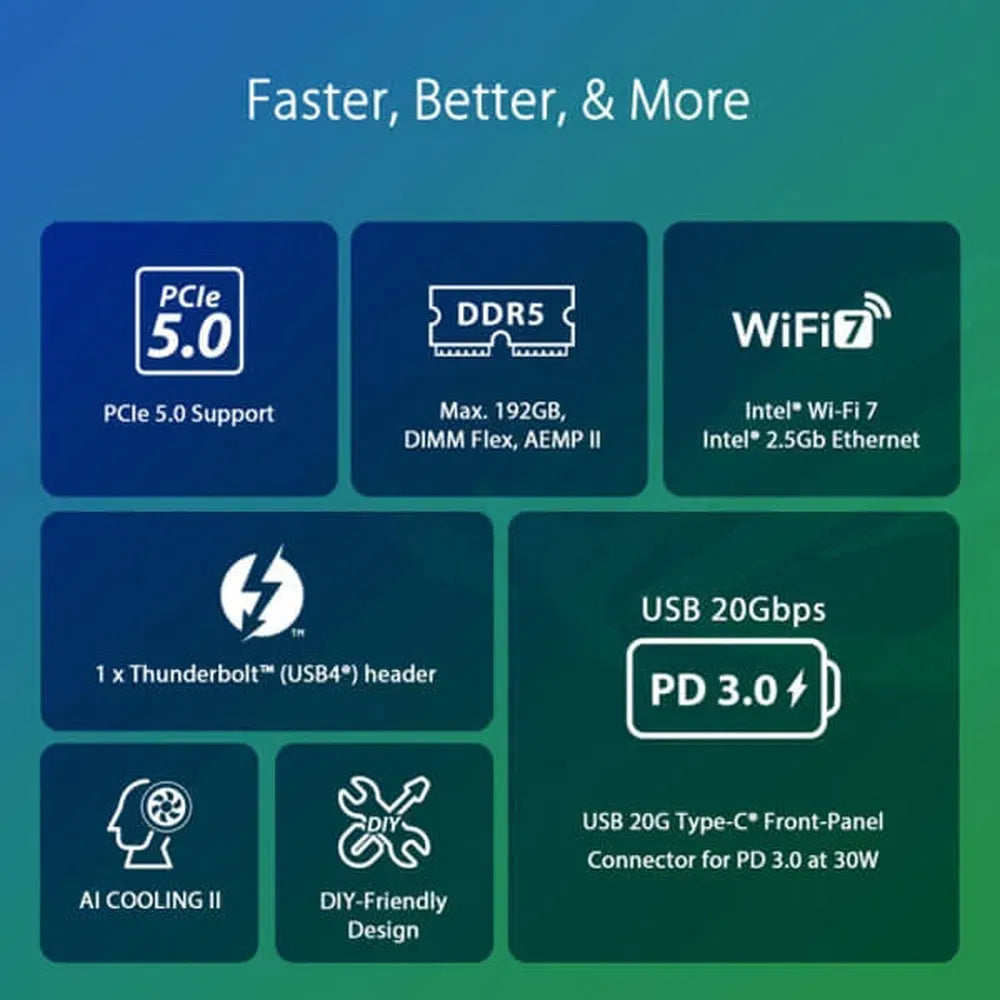 - High-Performance Networking: On-board WiFi 7 (802.11be) and Intel 2.5 Gb Ethernet with ASUS LANGuard