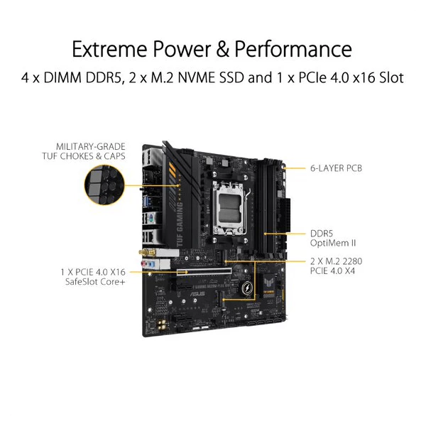 ASUS TUF GAMING A620M-PLUS WIFI takes all the essential elements of AMD Ryzen 7000-series processors and combines them with game-ready features and proven durability. Engineered with military-grade components, an upgraded power solution and a comprehensive cooling system, this motherboard goes beyond expectations with rock-solid and stable performance for marathon gaming. TUF GAMING motherboards also undergo rigorous endurance testing to ensure that they can handle conditions where others may fail. Aesthetically, this model incorporates rugged off-black and geometric design elements to reflect the dependability and stability that defines the TUF GAMING series.