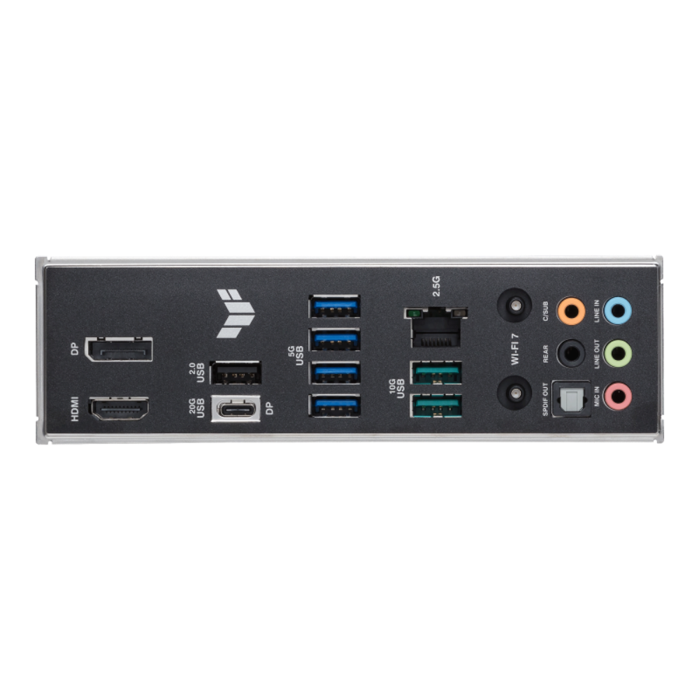 | Back Panel I/O Ports | 1 x USB 20Gbps port (1 x USB Type-C® with DP Alt mode) 2 x USB 10Gbps port (2 x Type-A) 4 x USB 5Gbps ports (4 x Type-A) 1 x USB 2.0 port (1 x Type-A) 1 x DisplayPort 1 x HDMI™ port 1 x Wi-Fi Module 1 x Realtek 2.5Gb Ethernet port 5 x Audio jacks 1 x Optical S/PDIF out port |