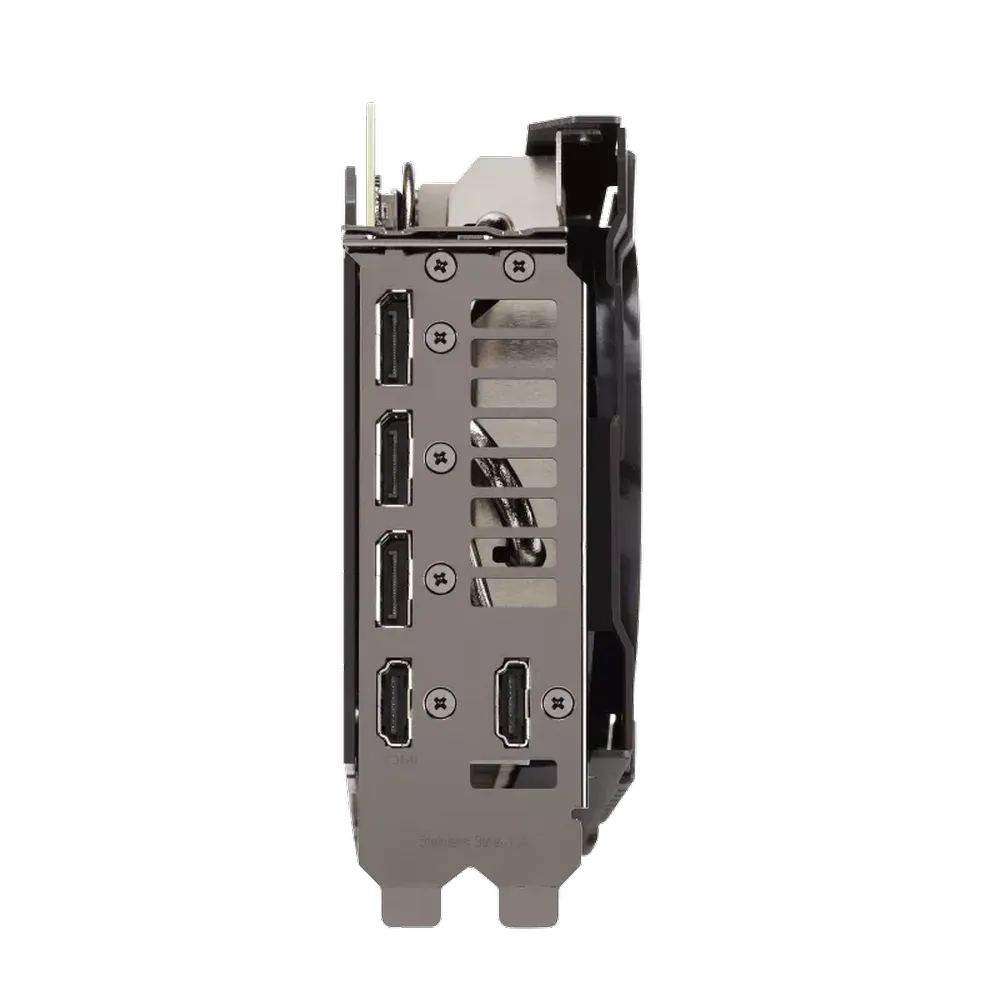 The underside of the card reveals a host of improvements. Most of the rear is swathed in a protective metal backplate that prominently features a wide vent. The vent allows hot air to escape towards chassis exhaust fans instead of being recycled back into the GPU cooler. Beneath the GPU, a bracket provides consistent mounting pressure between the die and heat spreader. Stainless steel is used for the I/O bracket to protect ports and provide a more secure mount. A conveniently placed Dual Bios switch allows customization of the card's default performance profile without software.
