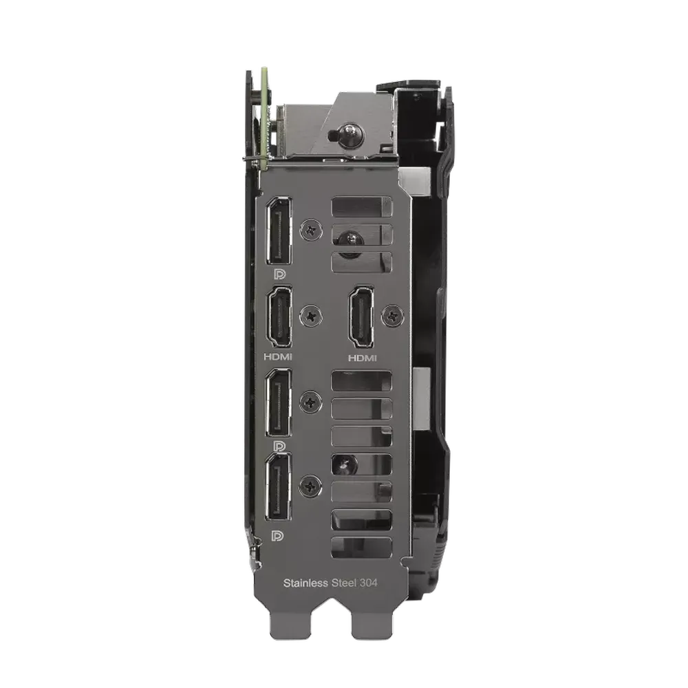 The underside of the card reveals further improvements. Most of the rear is swathed in a protective metal backplate that prominently features a wide vent. The vent allows hot air to escape towards chassis exhaust fans instead of being recycled back into the cooler. Stainless steel is used for the I/O bracket to protect ports and provide a more secure mount. A conveniently placed Dual Bios switch allows customization of the card’s default performance profile without software.