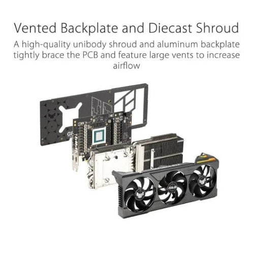 A high-quality diecast shroud and aluminum backplate prevent PCB flex and feature large vents to further increase heat dissipation.