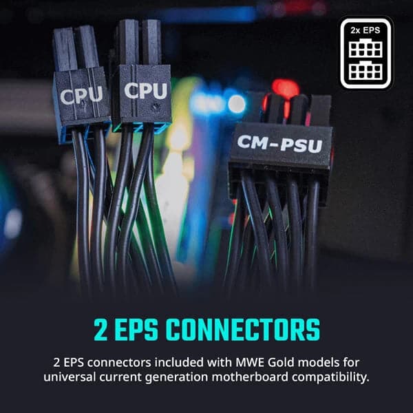 Cooler Master MWE 750 V2 80+ Gold Fully Modular Power Supply (750W) comes standard with 2 EPS connectors in order to ensure universal compatibility with all current gen motherboards. Whether you get the minimum wattage level at 550W or the maximum at 850W, you never have to worry if you'll have enough connectors to use your ideal components