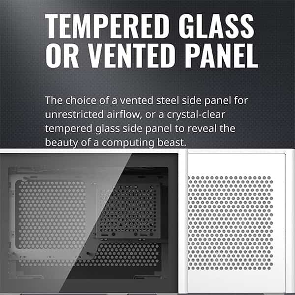 Keep cool with a highly vented side panel, or look cooler with a crystal-clear tempered glass panel; both are included to satisfy performance and style preferences. Fit large graphics cards in the 3-slot capable NR200P, or utilize the two vertical cards slots with the included PCI riser to turn graphics cards and heads by making the GPU the centerpiece of the PC. Seven possible fan mounts, ample ventilation, and generous liquid and air-cooler clearances keep even the most powerful systems running at their optimum temperatures and speeds. The chassis frame is wrapped in a sleek and tasteful powder-coated steel chassis that makes a statement on a desk.