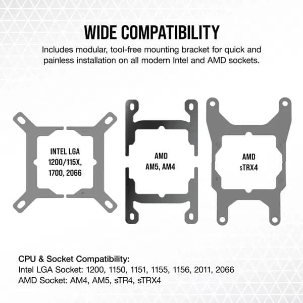 Extended tubing length of 400mm (H100i, H115i) / 450mm (H150i, H170i), modular tool-free mounting brackets, and pre-applied XTM70 thermal paste make for easy installation on the latest Intel® and AMD® motherboard sockets, including LGA 115X, 1200, 1700, 2011, and 2066, plus AMD Socket AM4, AM5, and sTRX4/sTR4.