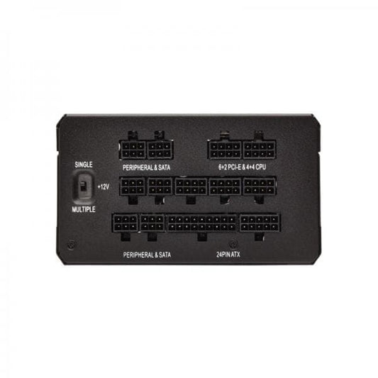 Toggle single 12V rail or multi 12V rail mode. In the “SINGLE” position, the full output capability of the power supply’s 12V rail is available to any and all connectors, while in the “MULTIPLE” position, each individual connector has Over-Current Protection so no more than 40A of current can be delivered on any given cable.