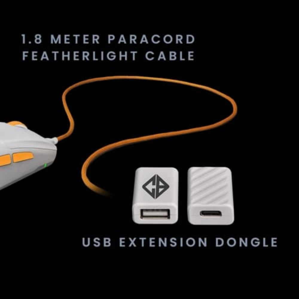 PTFE mouse feet for low-friction glide, 500mAh rechargeable battery, customizable via software, and 1.8m paracord featherlight cable with USB extender.