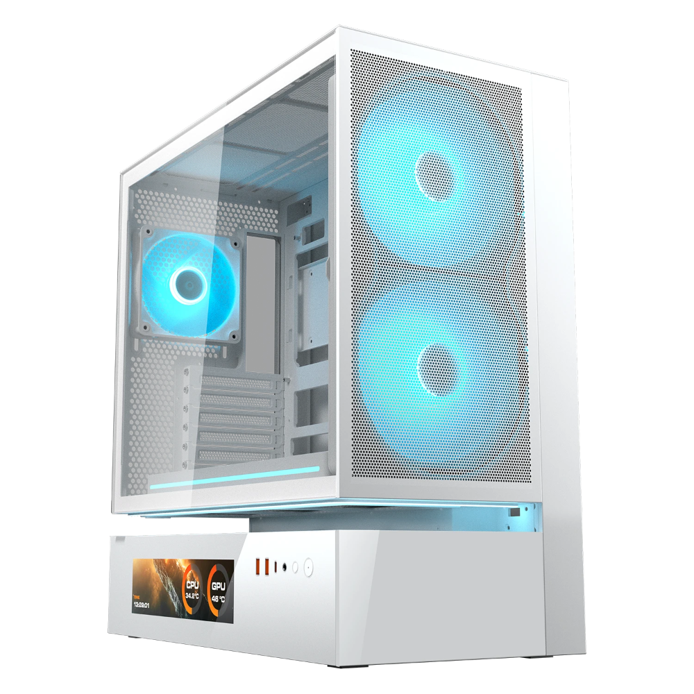 The CFV235 Mesh Vision is a new kind of PC case featuring the innovative Central Floating Ventilation (CFV) structure. This divides the PSU cabin and main chamber, retooling the open space in between as a cooling advantage by accessing extra ventilation, preserving a compact footprint without compromising architecturally-enhanced cooling. An integrated 9.16-inch IPS TFT LCD panel provides real-time, software-controlled system monitoring in ultra-crisp 1920x 462 resolution at a 60Hz refresh rate, displaying critical data and customizable visuals.