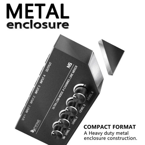 - A heavy duty metal enclosure construction stereo mixer and the knobs have firm adjustment. There is a simple LED when 4 channel mixer is powered on. Its small size fits perfectly on top of your keyboard, allowing quick and convenient adjustments to monitor mix.