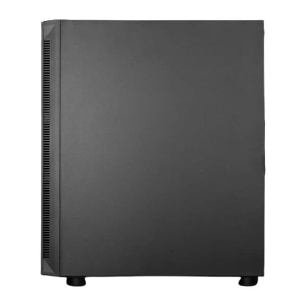 A jet black mid-tower case with crossed cutting design front panel containing two RGB light strips showcasing conciseness, elegance, and stylishness.