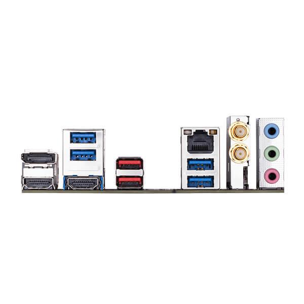 1 x DisplayPort 2 x HDMI ports 2 x USB 3.1 Gen 2 Type-A ports (red) 4 x USB 3.1 Gen 1 ports 1 x RJ-45 port 2 x SMA antenna connectors (2T2R) 3 x audio jacks |