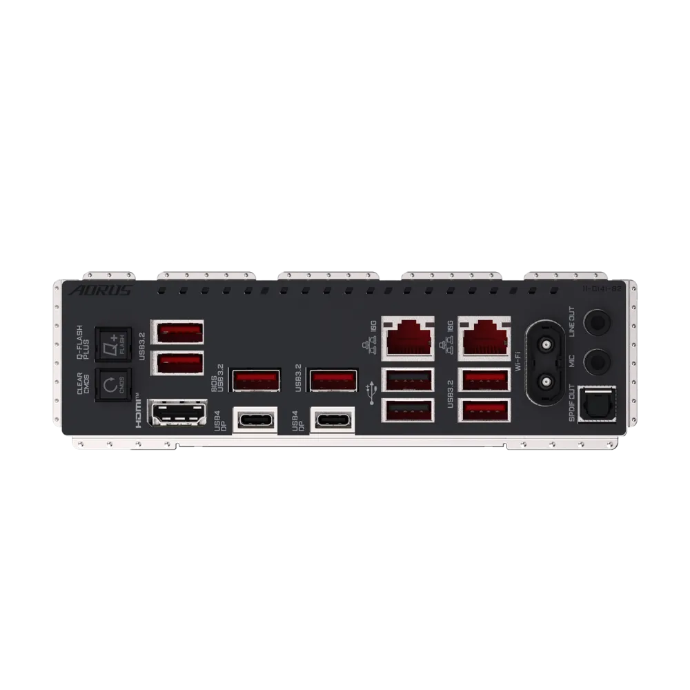 1 x Q-Flash Plus button 1 x Clear CMOS button 1 x HDMI port (Note) 2 x USB4® USB Type-C® ports (DisplayPorts (Note)) 6 x USB 3.2 Gen 2 Type-A ports (red) 2 x USB 2.0/1.1 ports 2 x RJ-45 ports 2 x antenna connectors (2T2R) 1 x optical S/PDIF Out connector 2 x audio jacks (Note) Actual support may vary by CPU. |