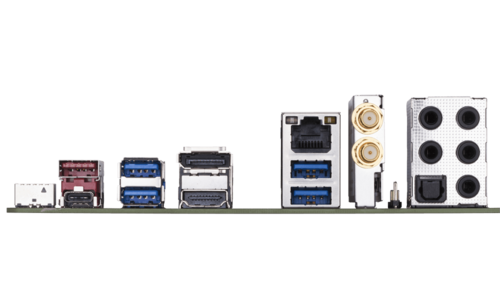 4 x USB 2.0/1.1 ports 2 x SMA antenna connectors (2T2R) 1 x HDMI port 1 x USB Type-C™ port, with USB 3.1 Gen 2 support 2 x USB 3.1 Gen 2 Type-A ports (red) 3 x USB 3.1 Gen 1 ports 1 x RJ-45 port 1 x optical S/PDIF Out connector 5 x audio jacks |