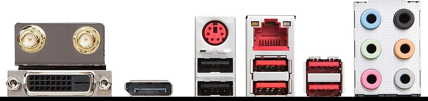 | Back Panel I/O Ports | Wireless / Bluetooth PS/2 Combo Port LAN Port HD Audio Connectors DVI-D Display Port USB 2.0 Ports USB 3.1 Gen1 Ports USB 3.1 Gen2 Ports |