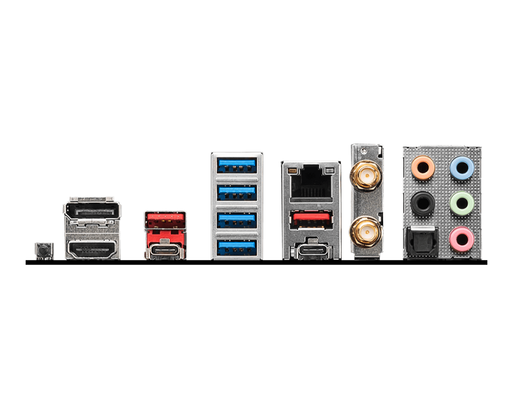 DisplayPort USB 3.2 Gen 2 10Gbps (Type-A) USB 3.2 Gen 1 5Gbps (Type-A) 2.5G LAN Wi-Fi / Bluetooth Audio connectors Flash BIOS Button HDMI™ USB 3.2 Gen 2 10Gbps (Type-C Display port) USB 3.2 Gen 2x2 20Gbps (Type-C) USB 3.2 Gen 2 10Gbps (Type-A) S/PDIF-OUT |