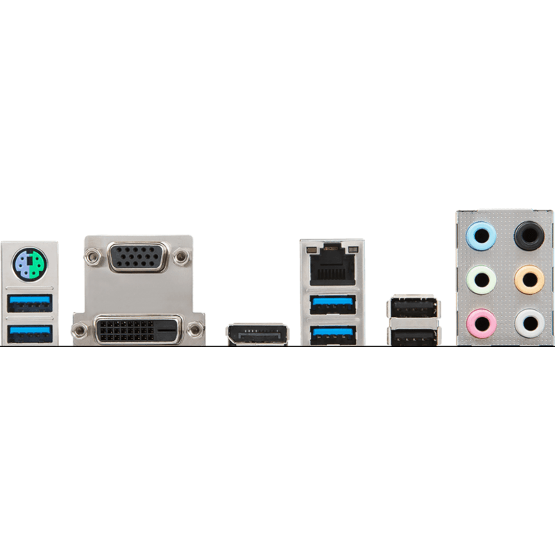 PS/2 Combo Port VGA Port LAN Port USB 2.0 HD Audio Connectors USB 3.1 Gen 1 DVI-D Port DisplayPort USB 3.1 Gen 1 |