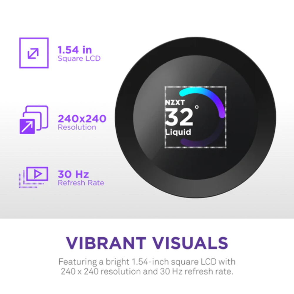 - Custom LCD Screen: Display real-time system temps, animated GIFs, custom images, or web integrations like Spotify and YouTube on a bright 1.54" square LCD — fully customizable through NZXT CAM software.