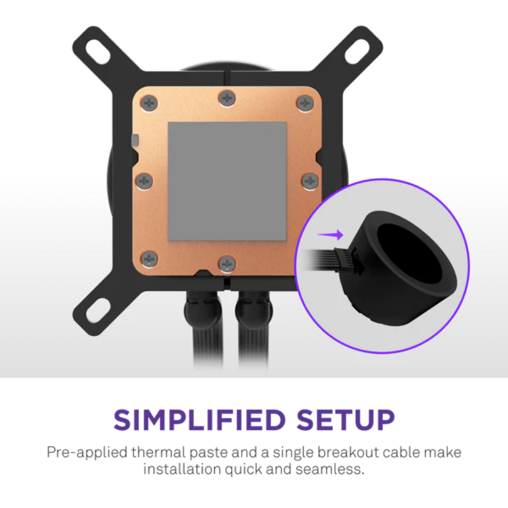 - Easy Installation: Pre-applied thermal paste and a single breakout cable from the pump cap speed up installation and reduce cable clutter.