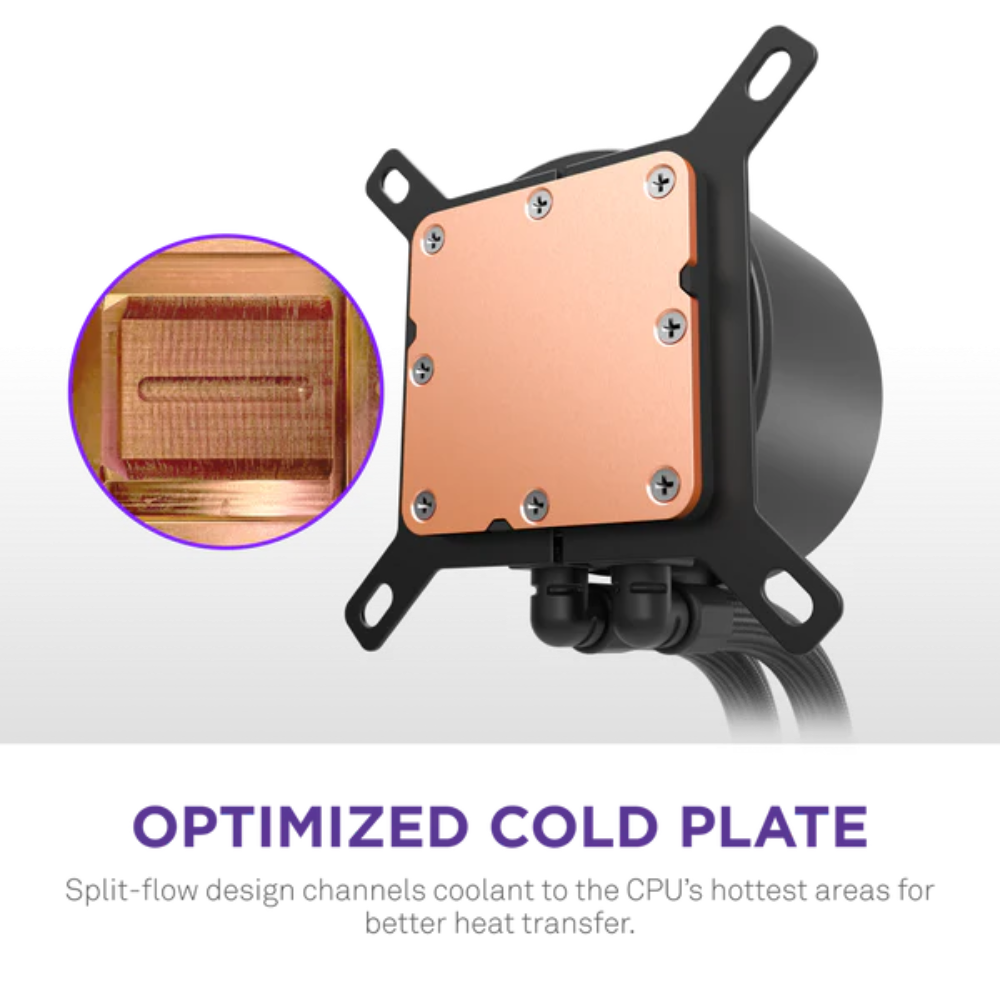 - Optimized Cold Plate: The split-flow copper cold plate channels coolant to the CPU’s hottest areas for better heat transfer, lower temps, and more consistent thermal performance.