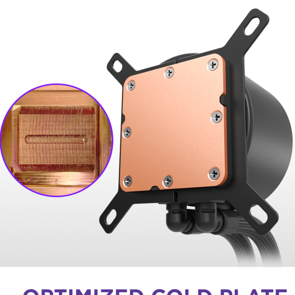 - Optimized Cold Plate: The split-flow copper cold plate channels coolant to the CPU’s hottest areas for better heat transfer, lower temps, and more consistent thermal performance.
