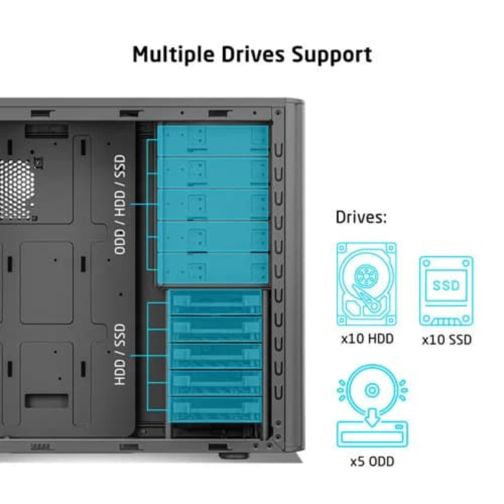 The A1838 case accommodates up to 5 ODDs, 10 SSDs, and 10 HDDs, offering extensive storage options for flexible and versatile PC