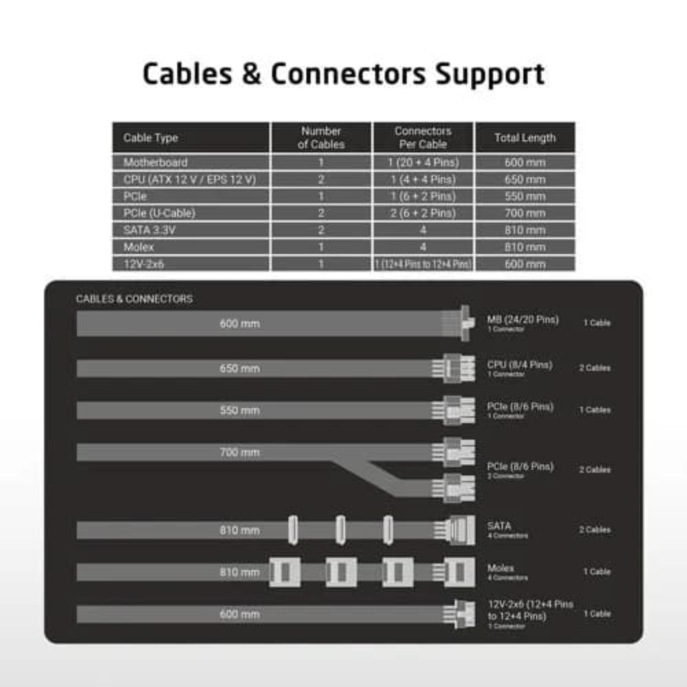 The XP-1000 P has enough connectors for your new gaming PC or Workstation, along with 3x Molex and 12x SATA Power and 1x FDD Connectors 1. 1x 24-Pin ATX(Motherboard) Power (600mm) Cable 2. 2x 8(4+4)-Pin EPS(CPU) Power (650mm) Cables 3. 2x 8(6+2)-Pin PCIe Power (550mm), 1x 8(6+2)-Pin PCIe Power U-Cables 4. 1x 16(12+4)-Pin 12VHPWR (600mm) Cable