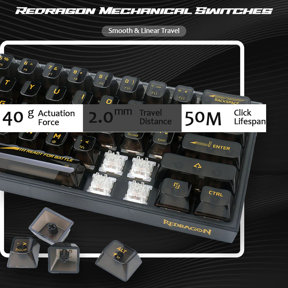 Most quiet mechanical switch, linear and soft key travel makes every click easy to register. Hot-swappable with other Redragon switches. Made to last with switches rated for 50 million keypresses.