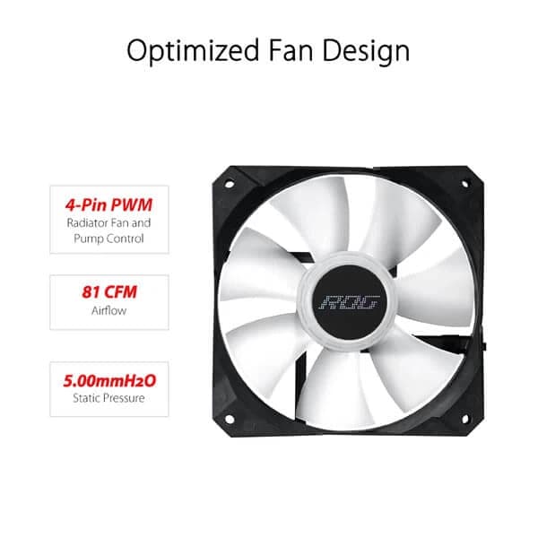 The ROG radiator fans are specifically tuned to deliver optimum performance on ROG Strix LC II series radiators. The fans generate 81 CFM / 5.0 mmH2O for exceptional cooling efficiency.