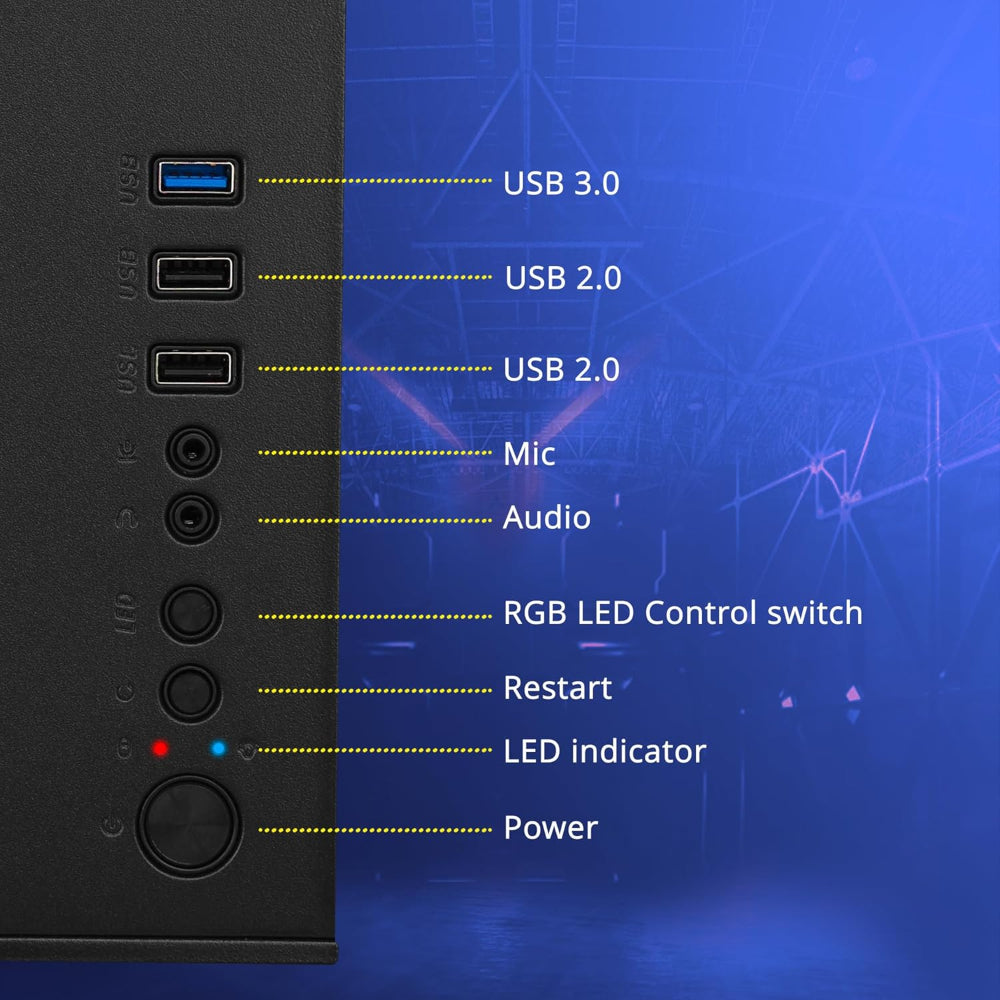 At the top section of the chassis, you’ll find a USB 3.0 port, along with two additional USB ports, as well as microphone and headphone jacks, offering a wide range of connectivity options